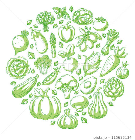 Farm fresh vegetables, round shape form. Veggies vector green line icons on isolated background. Organic food, natural eco products. Square card for banner, poster, menu, social media, web design