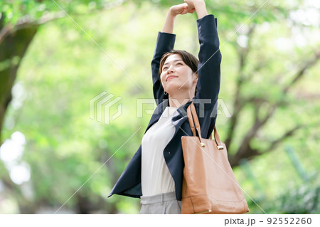 タブレットを小脇に抱える若い女性 ビジネスカジュアル