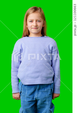 Child wearing a blue sweater and light blue pants stands confidently in front of a green background