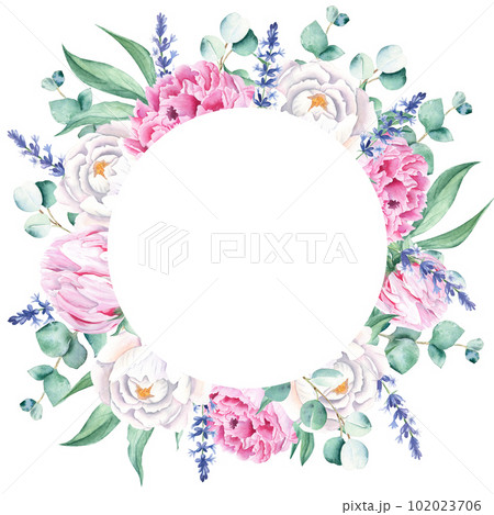 Watercolor pink and white peonies, eucalyptus branches, lavender circle frame isolated on white background. Hand drawn botanical illustration. For wedding invitations, save the date, greeting card