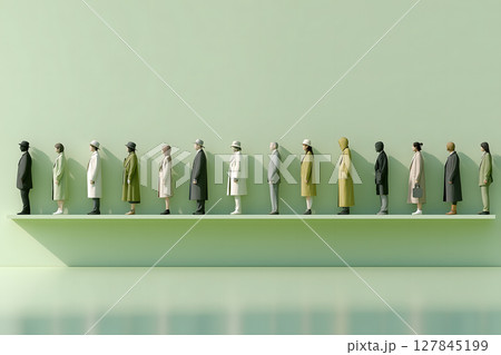 Diverse silhouettes of workforce standing in line, showcasing various styles and colors of clothing against soft green background