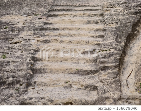 Sunlit aged limestone steps featuring deep grooves and scattered moss in archaeological ruins
