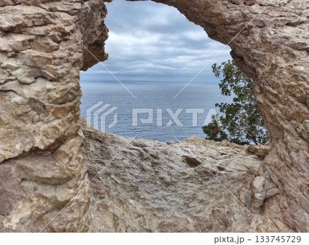seaside rocky view, coastal stone with lichens, weathered rocks providing seaside glimpses
