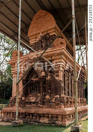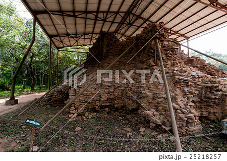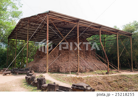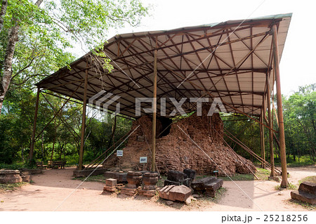 ベトナム中部にあるミーソン遺跡(ミーソン聖域)の崩壊した遺跡と遺跡保護のためにかけられた屋根