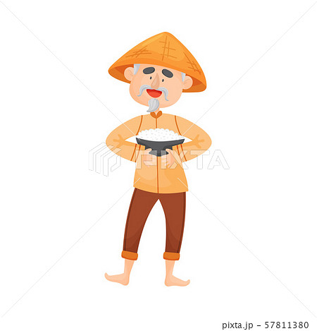 Elderly man is holding a gray bowl of rice. Vector illustration.