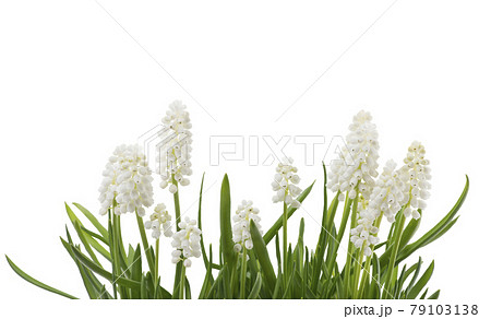 Small blue flowers of muscari and snowdrops in a spring floral border isolated on white