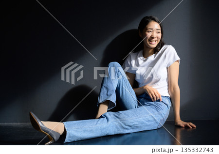 Vector illustration. A man in a black shirt and light gray pants. In the background are round elements, the pose is relaxed, the style is elegant.