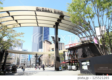 日本の東京都市景観 2月・池袋駅前の池袋西口公園・“虹色”に輝くグローバルリングなどを望む=2月1日