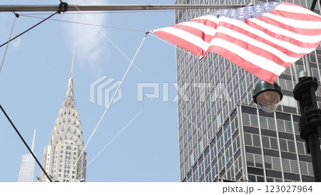 New York, american flag waving. Chrysler building. Manhattan midtown city street banner, patriotism.