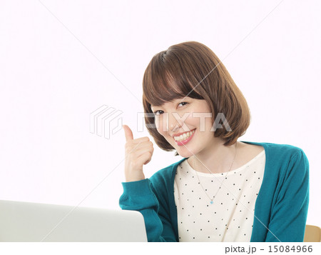 パソコンで仕事をしながらグーサインをする女性