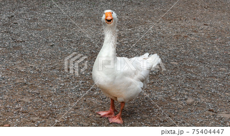 Large white goose with orange beak, mouth open.