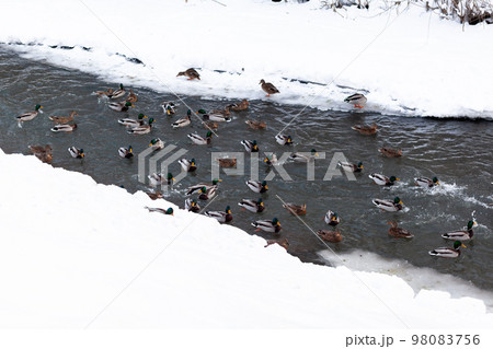Ducks exploring a frozen lake in the city, with some of them swimming in the open water. Wonder of winter wildlife in park