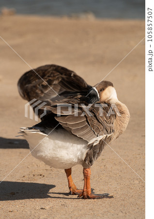 Swan goose stand on the shore and seek something to eat.Selective focus.
