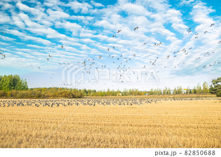 A big flock of barnacle gooses is flying above the field. Birds are preparing to migrate south. September 2019, Finland
