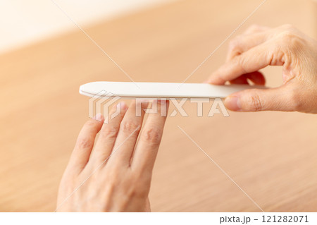 爪磨きで手の爪のケアをするミドル〜シニア女性