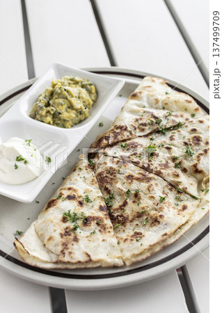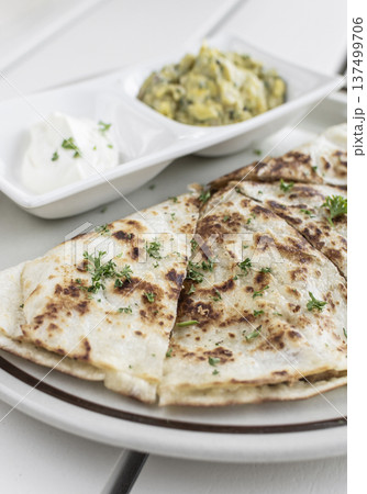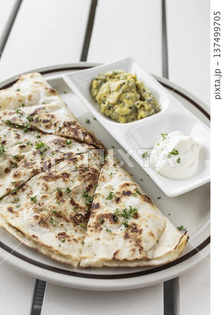 cheese quesadilla plate with guacamole and sour cream on white restaurant table in mexico