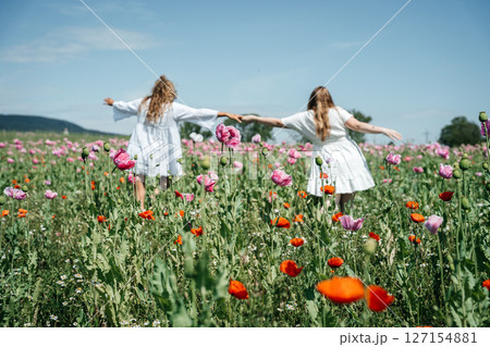 Two girls in white dresses embrace from behind, standing in a field of pink poppies gently swaying in the wind. A high-quality photo capturing the warmth and serenity of the moment amidst the vibrant