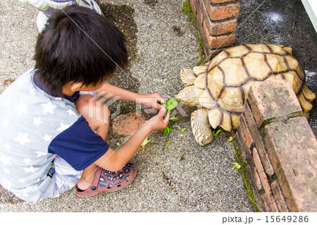 陸亀に餌をあげる親子 ケヅメ陸ガメ ヘルマンリクガメ