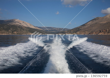 Traveling by sea on a yacht from the AGIA EFIMIA marina, KEFALONIA Island, Ionian Islands, Greece in the summer morning. Horizontal.