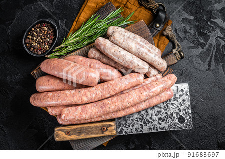 Raw meat sausages made from beef or pork, fresh meat for barbecuing or grilling. Raw sausages