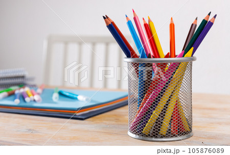 Concept of preparation for school. Different school supplies on the table