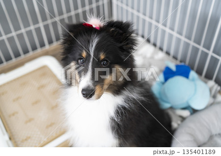 犬, 子犬, パピー, シェットランドシープドッグ, シェルティ, トライカラー, 室内, ケージ,