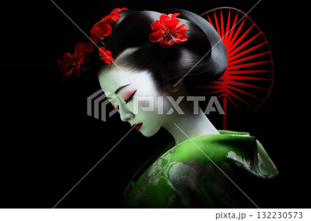 geisha woman with flower in her hair and dressed in green kimono with red flowers, dancing with red cloth on a dark background
