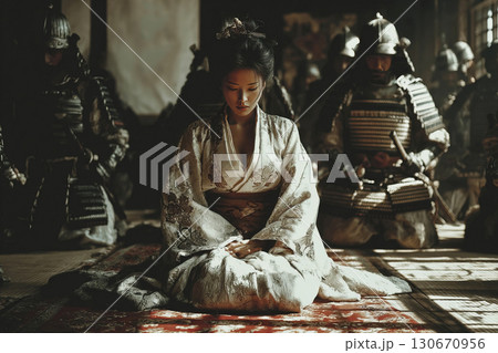 Geisha performs traditional tea ceremony surrounded by samurai warriors in Japan