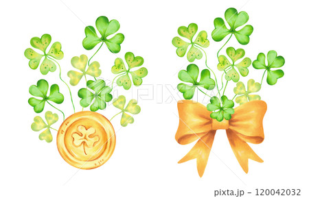Gold coin and yellow bow with clover leaves. St. Patrick's Day composition. Watercolor and marker illustration. Hand drawn isolated art. Sketch of luck, wealth or success for holiday design.