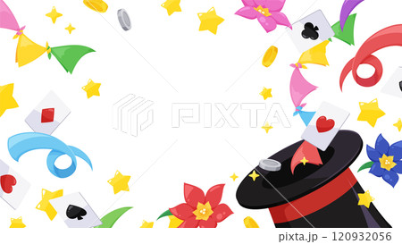 手品でシルクハットから色々なものが飛び出す背景イラスト_16:9