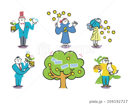 おとぎ話のキャラとビジネスパーソンが進める財テク お金の生る木 セット イラスト素材