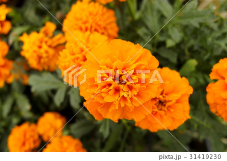 Beautiful orange marigolds flowers in bloom in autumn, Tagetes.