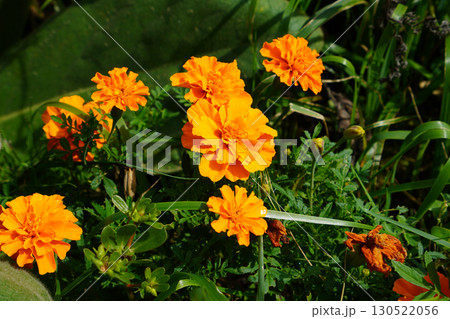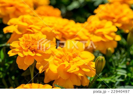 秋の公園に咲くマリーゴールドのオレンジ色の花