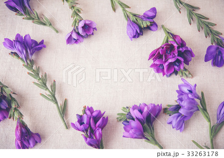 Purple flowers on linen copy space background