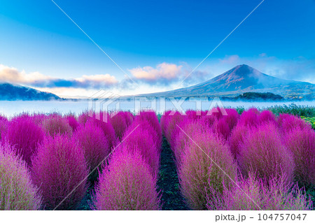 【富士山素材】紅葉したコキアと朝の河口湖から見る富士山【山梨県】