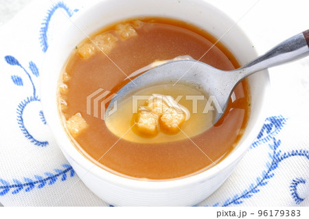 熱々のオニオンコンソメスープを、木のスプーンでかきまぜる