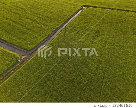 Nature forest green tree magic sunlight beam light in woodland. Beautiful rays of sunlight in tranquil green forest. Sumbeam through ray light outdoors park. Natural Blurred background summer time.