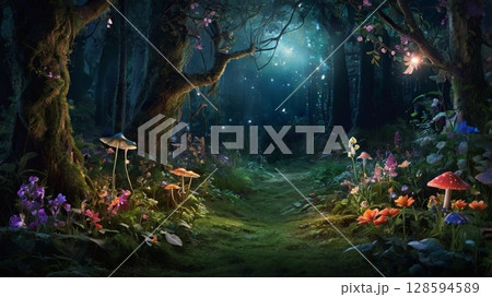 Magical enchanted forest with glowing fireflies, butterflies and colorful flowers. Fantasy nature background concept