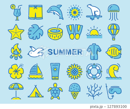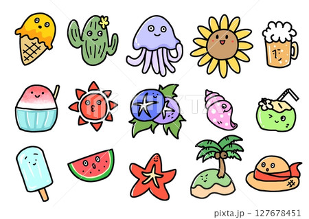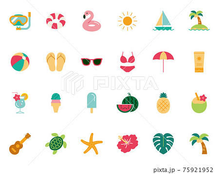 夏にかかせないアイテム。ポップでカラフルなイラスト。シンプルなかわいいアイコンのセット。