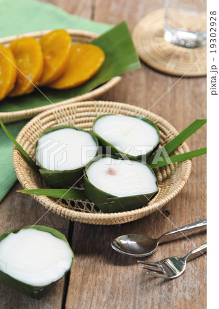 Traditional Thai dessert (Khanom Tako), Pudding with coconut cream topping in pandan leaf