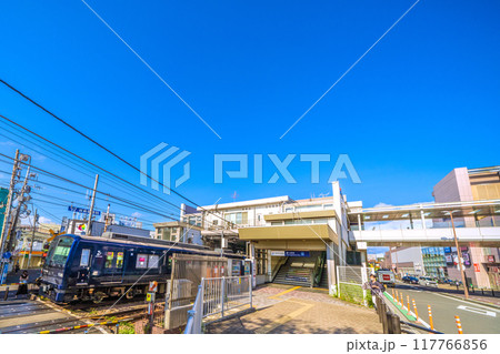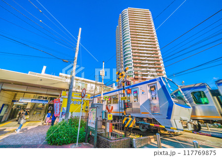日本の横浜都市景観 8月。SOTETSU 鶴ケ峰駅前の踏切や電車、非常ボタンなどを望む=25日