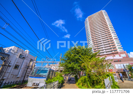 日本の横浜都市景観 8月。SOTETSU 鶴ケ峰駅や電車、タワマンなどを望む=令和6年8月25日