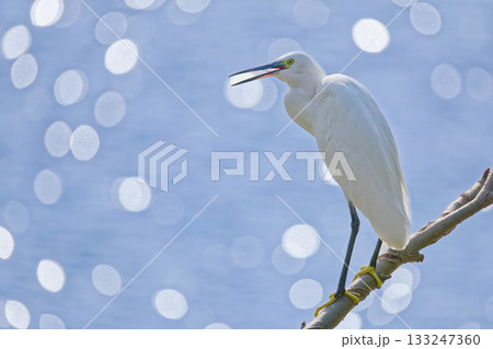 木の枝で鳴くコサギ