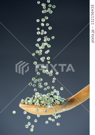 Organic green peppercorns fall from above onto a wooden spoon, ideal for seasoning, cooking and culinary ingredient imagery.