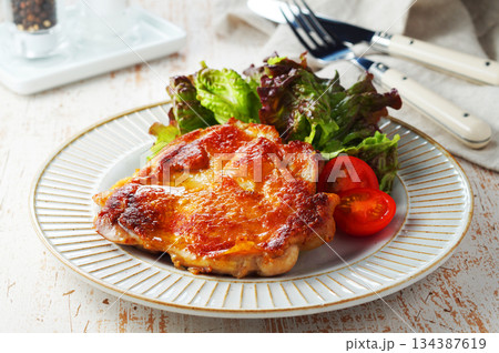 フライパンで鶏もも肉の照り焼きチキンステーキを焼く