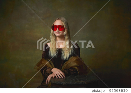 Vintage style portrait of young charming girl in medieval dress and modern red eyewear isolated on dark green background. Art, beauty, style, imitation