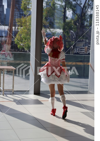 窓沿いにポーズを決める可愛いコスプレイヤーの後ろ姿