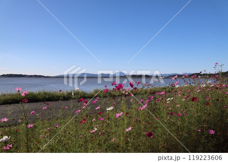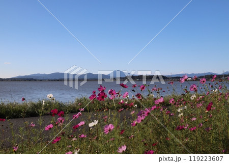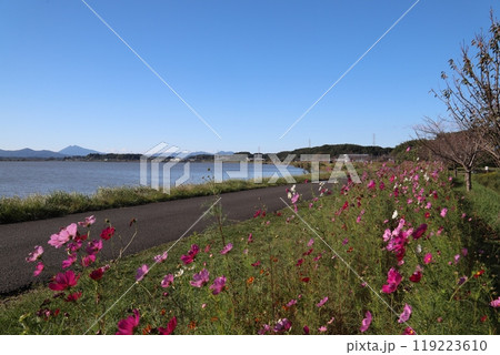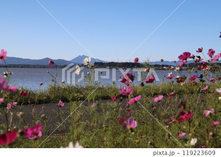 霞ヶ浦に咲くコスモスと筑波山