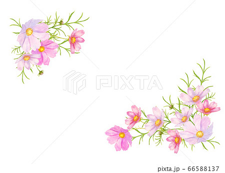 水彩で描いたピンクのコスモスの花が咲き乱れる背景フレームイラスト【手描き】透過背景 コピースペース