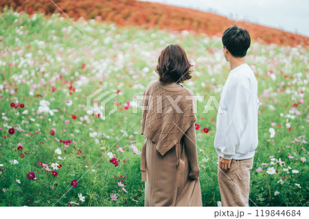 コキアとコスモス畑を見る若いカップルの後ろ姿